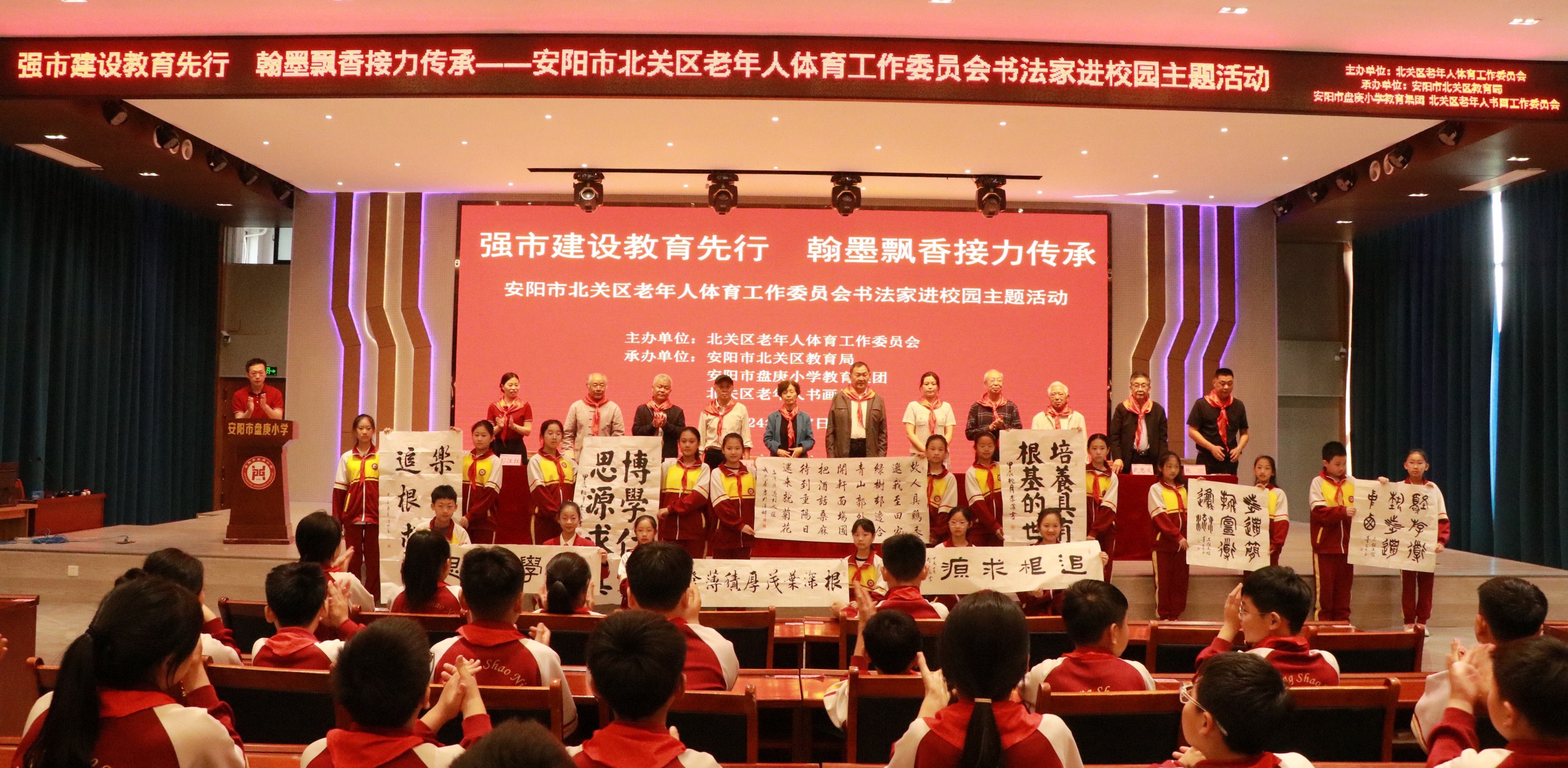 为庆祝2024年河南省第十四届老年人运动会胜利召开,5月7日北关区老年体工委书法协会开展了“大手拉小手书法进校园”活动。原北关区委副书记、区人大常委会主任、现任北关区老年体工委执行主席王才根,原北关区人大副主任吴蔚,区老年服务中心主任耿芳,区老年体工委委员、副秘书长 程永现,北关区教育局党组成员副局长李慎军 ,北关区老体委书画协会会长秦文生北关区老体委书画协会副会长贺文激,北关区老体委书画协会副会长李蒲,北关区老体委书画协会副会长赵清山,北关区老体委书画协会副会长武忠义。北关区教育局体卫艺股股长张城,安阳市盘庚小学党支部书记校长彭江红参加了此次活动。