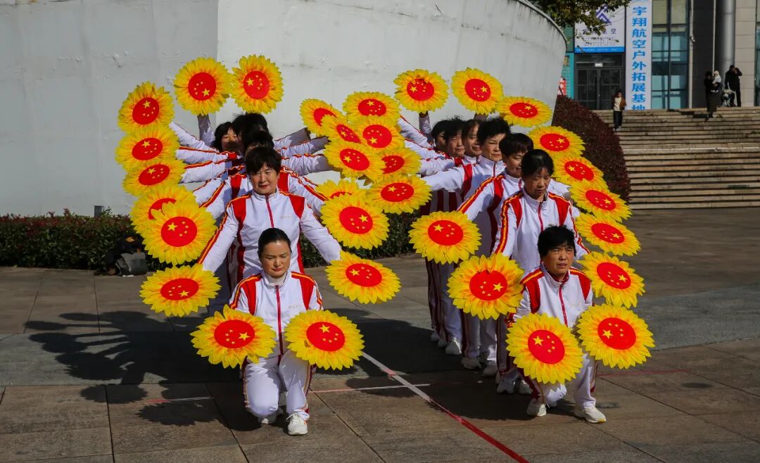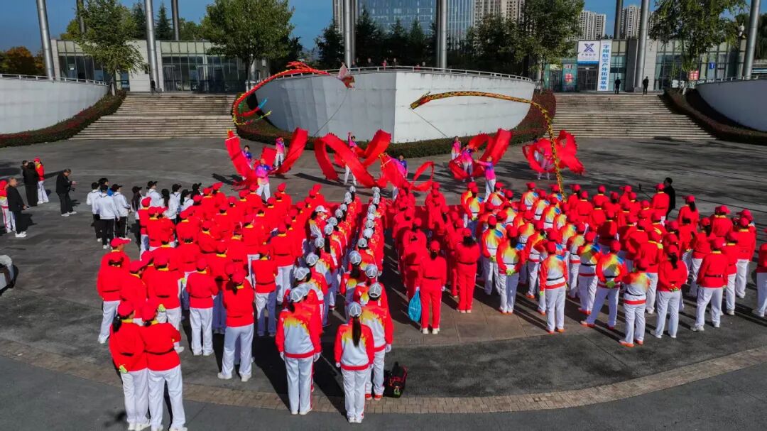 《骏马变形操》中,西峡健步走队24名队员组成流动方阵,以红绸扇为翼,接连变换出“寿”“龙”等十二种寓意吉祥的队形。动作整齐划一,气势如虹,宛若万马驰骋于金色原野。