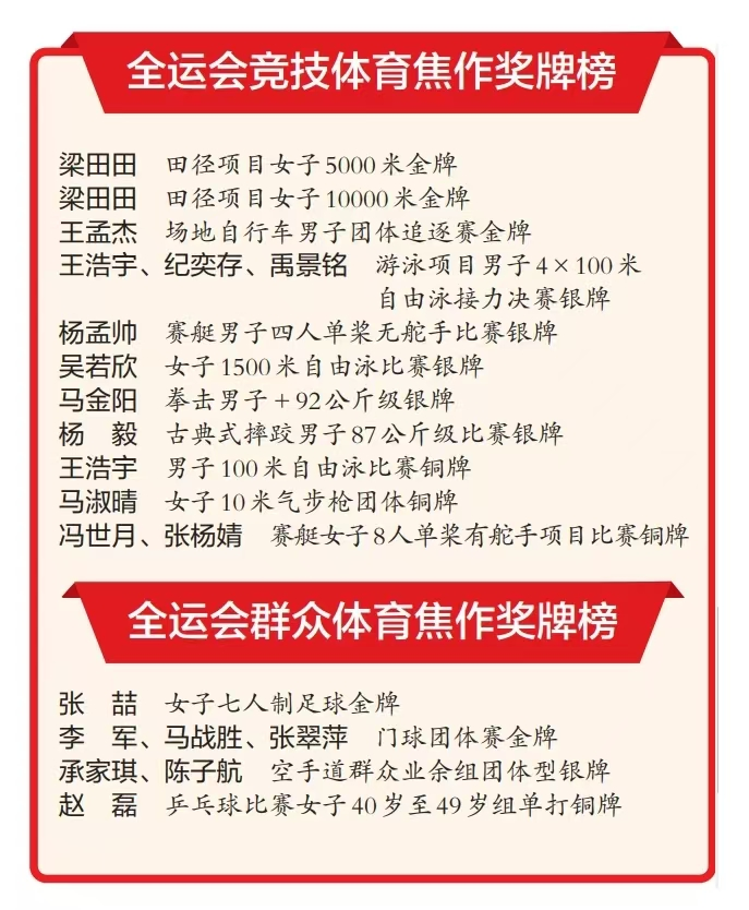 注④:指在第十五届全运会群众体育比赛项目中,焦作市代表队奋勇拼搏,斩获2金1银1铜共4枚奖牌,以群众体育的亮眼成绩,为350万焦作人民赢得荣誉,诠释“全民体育、共筑健康”的深厚底蕴。