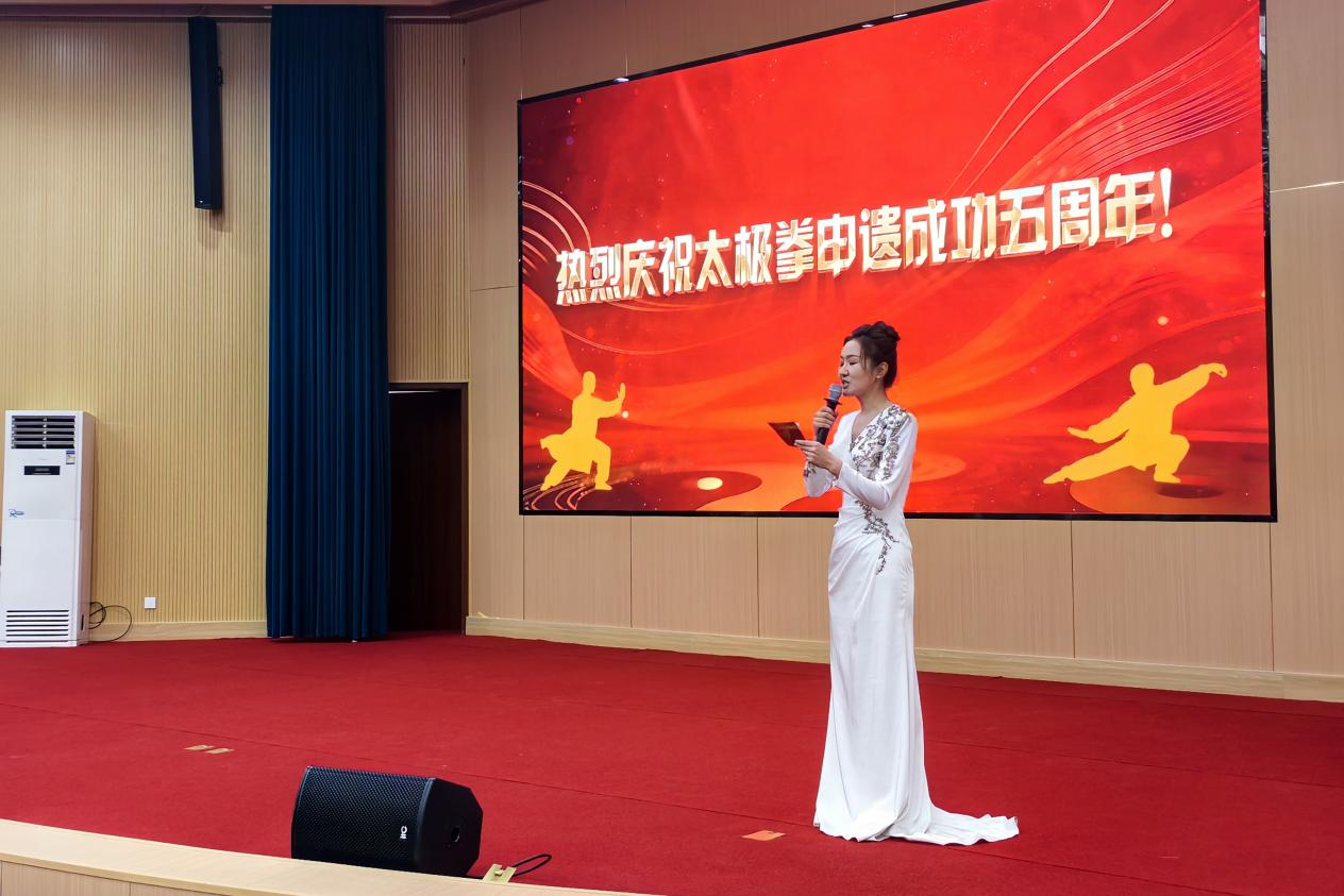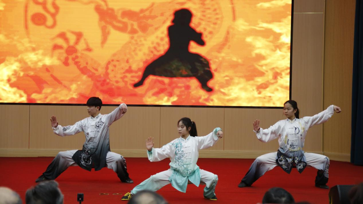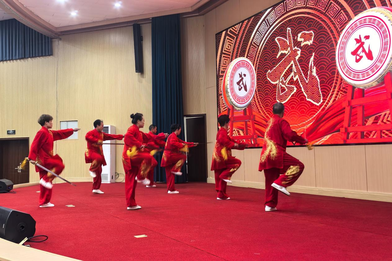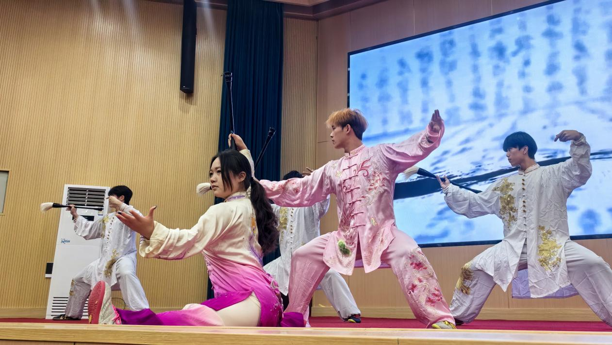 年近七旬的张令忠老师带来的春秋大刀表演《刀光掠影・气贯长虹》,一招一式虎虎生威,刀光映日间尽显 "百兵之帅" 的豪迈气势;焦作市朱天才太极拳研究会的集体太极剑《太极风骨・剑影循踪》,剑走轻灵如游龙飞凤,展现了 "兵中君子" 的潇洒风骨。国家级健将运动员、全国太极拳冠军杨艳与陈式太极拳第十二代传人张东武、朱向华联袂演绎的《冠军风范・一脉相承》,将专业水准与传承精神展现得淋漓尽致;河南理工大学学子们的《菁英铸魂・笔走春秋》,以太极笔法融合武术神韵,彰显了青年一代对传统文化的传承与创新。