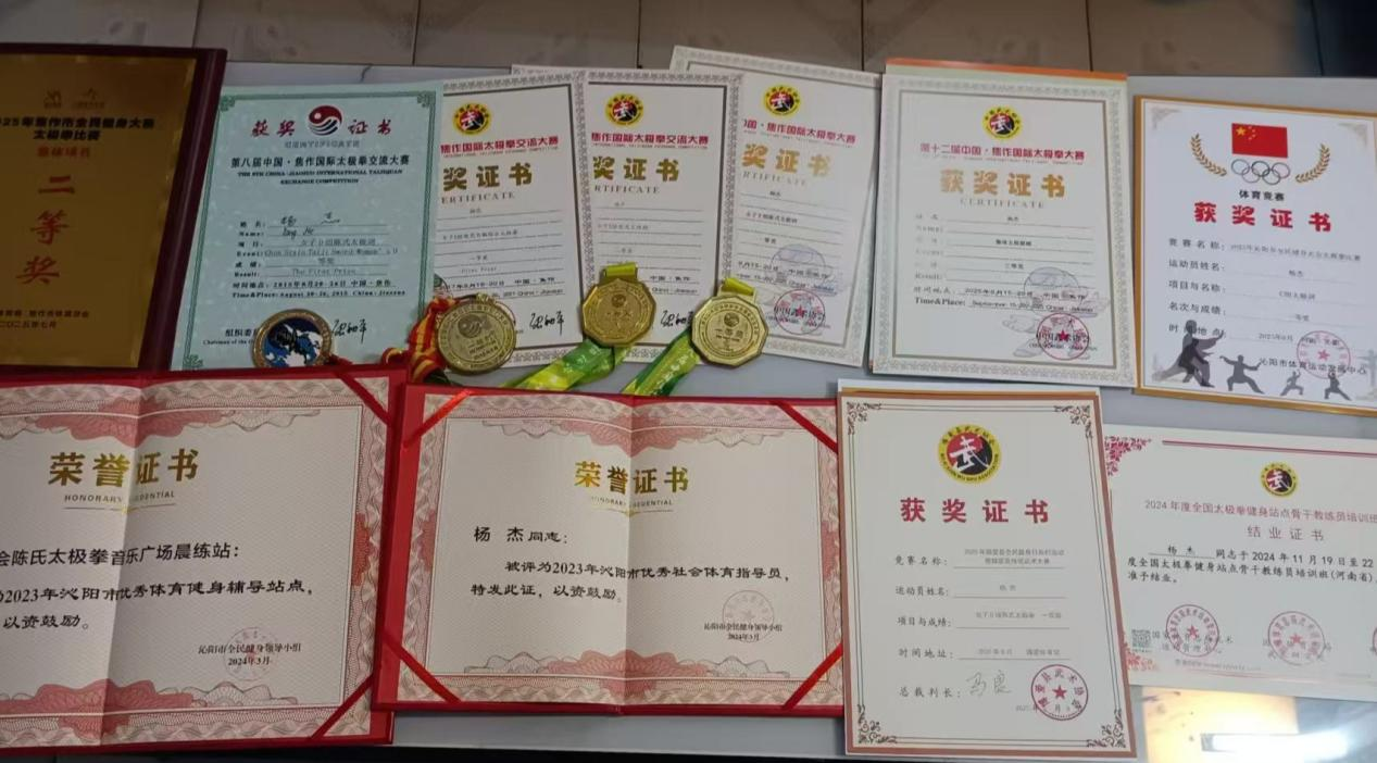 多年来,杨杰带领团队在赛事与公益舞台上双线绽放。她个人屡获年赛金奖、县市比赛一等奖等殊荣,2023年获评市优秀社会体育指导员,团队也荣获优秀体育健身辅导站点等称号。2025年更是团队的“丰收年”:全年开展19次多元活动,涵盖旅行社公益推广、沁阳春晚演出、敬老院慰问、各级太极拳赛事等,先后斩获国际年赛集体三等奖、焦作全民健身集体二等奖、沁阳“天庆杯”集体一等奖等多项荣誉;19名队员获得中国武术段位,18人成为太极非遗传承人,26名新学员顺利掌握八法五步、八段锦等项目,让太极文化的种子广泛播洒。