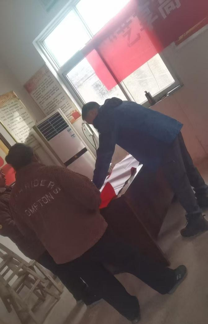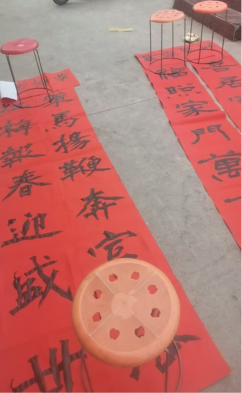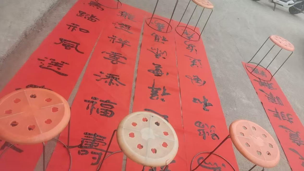 室外的空地上,红彤彤的春联整齐晾晒,与村民们脸上洋溢的笑容相映成趣,勾勒出一幅温馨的新春图景。村民们手捧春联,喜悦之情溢于言表,纷纷称赞这是最有意义的新春礼物。