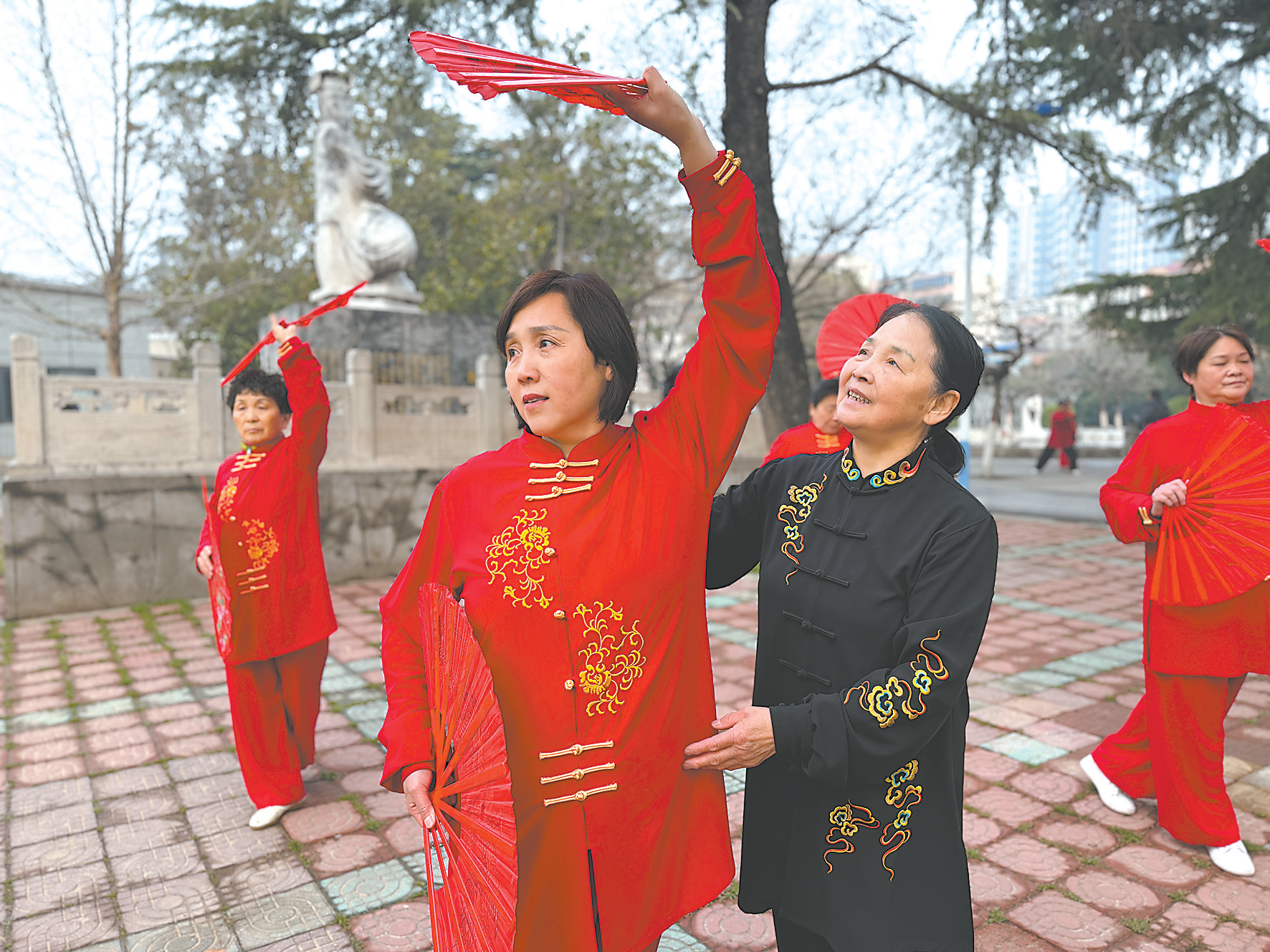王香花(前右)纠正拳友的动作。 本报记者 李 征 摄