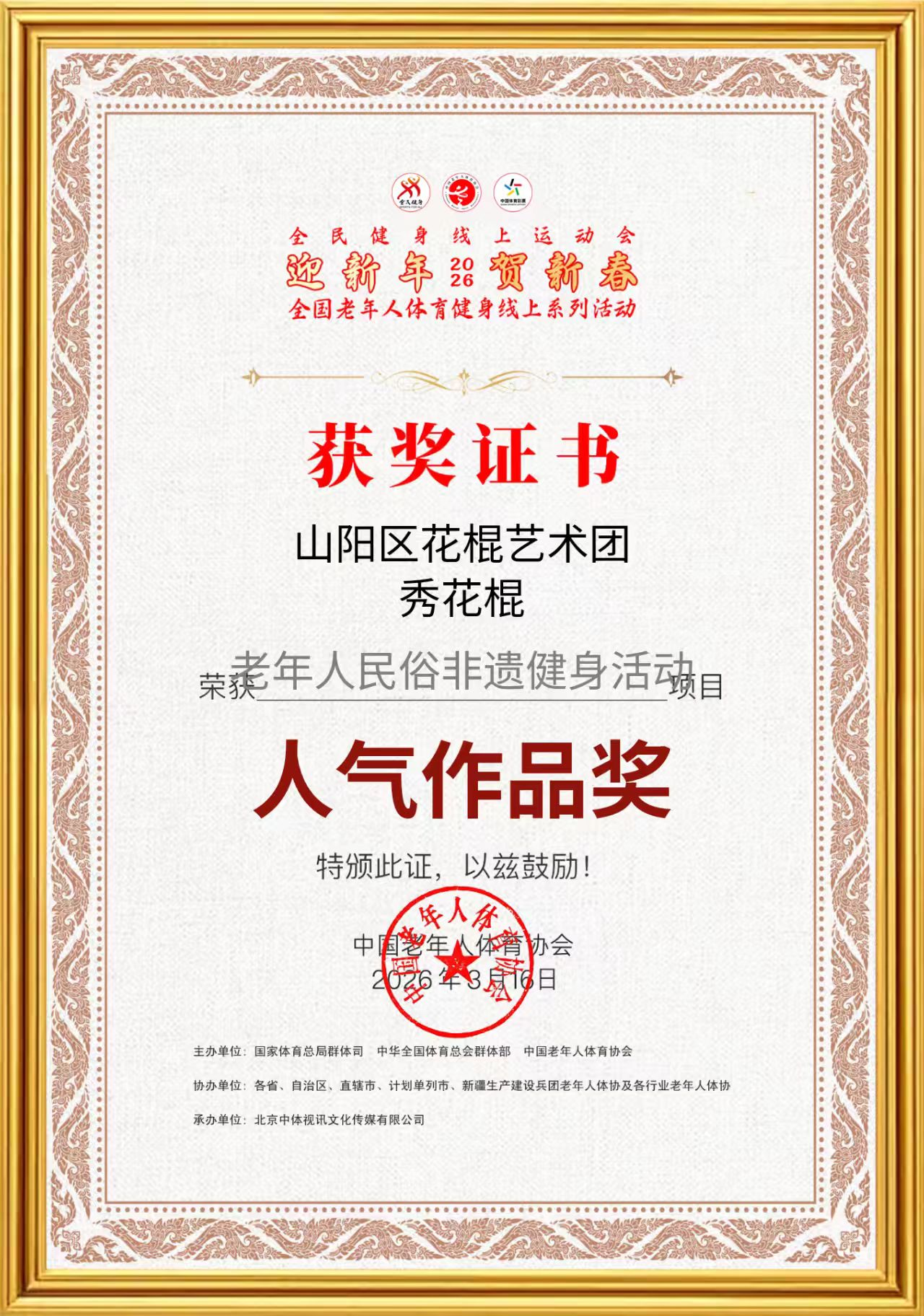 19位团员刻苦排练,以精湛的花棍技艺展现老年人风采,用昂扬的姿态诠释健康活力。在线上技能技巧大赛中,他们充分展现出良好的精神风貌与过硬的竞技水平。历经数月线上线下人气投票与专业评审的严格评定,焦作市山阳区老体协选送的《秀花棍》最终荣获老年人民俗非遗健身活动项目“人气作品奖”。